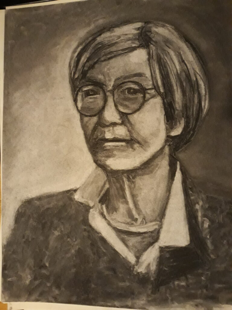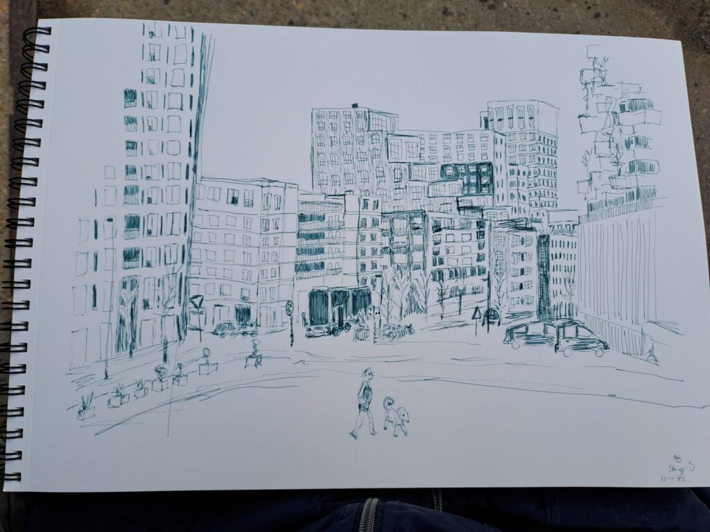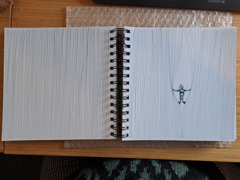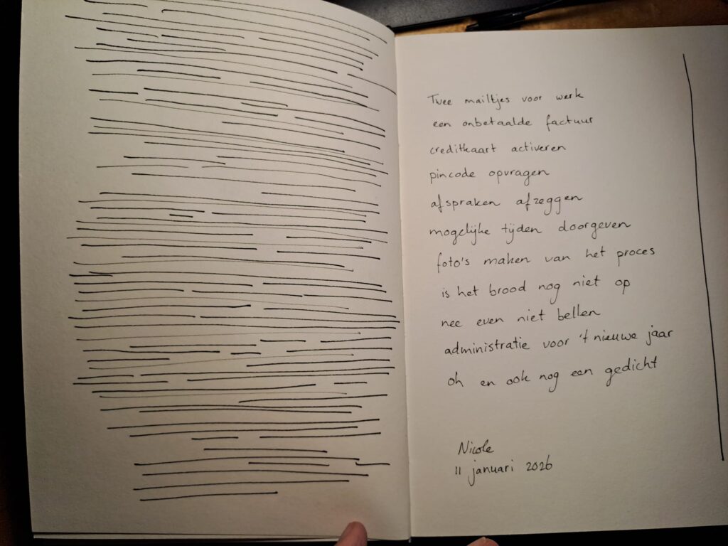 Een kernthema in mijn werk is tijd. Ik verbind lineaire tijd – gejaagd vooruit, gericht op vernieuwing ten koste van het oude – met circulaire tijd, die meebeweegt met seizoenen, levensfasen en eeuwige verbondenheid. Lineair biedt drive, circulair ritme en herhaling; samen creëren ze ruimte voor groei. Dit vertaalt zich in cyclische methodes, zoals bijvoorbeeld maandenlang dagelijks dichten (solo en samen), resulterend in een dichtbundel (Soms is vriendschap het hevigst in witregels, Exilic Press, 2024). Ik werk voornamelijk met fineliners, houtskool, ecoline, wol en drukinkt op papier – lagen die lineair opbouwen en circulair herhalen.