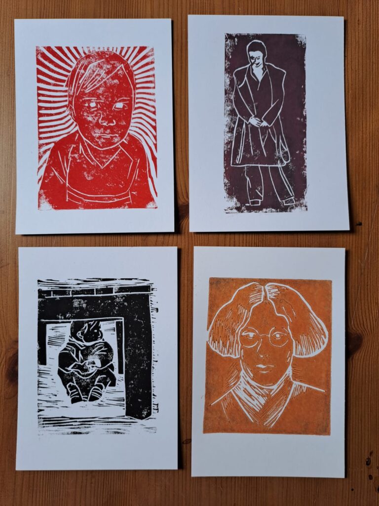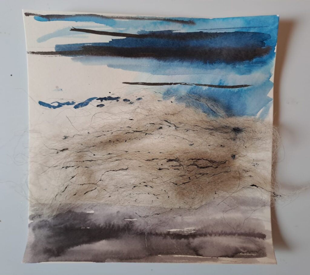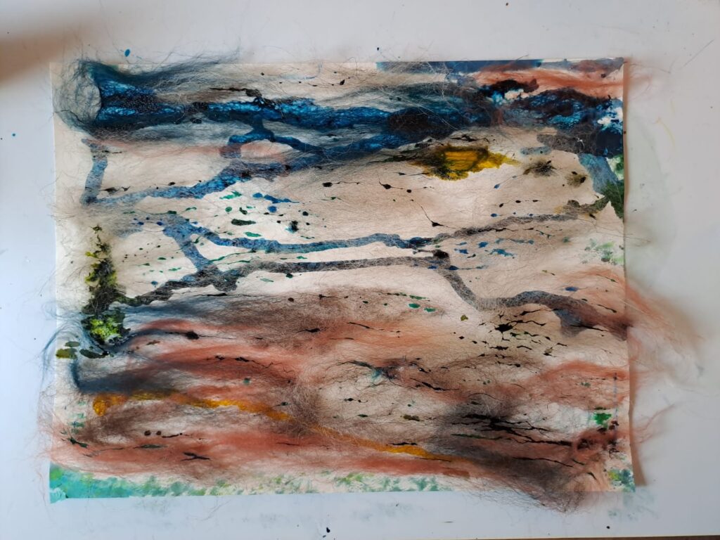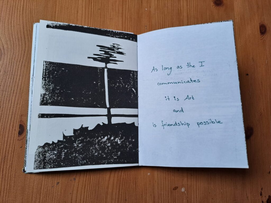 Mijn praktijk is dynamisch: ik zoek voortdurend nieuwe uitdrukkingsvormen voor het leven zelf. Recent richt ik me op vriendschap (2025-2026), als onderzoek naar hoe AI die rol (niet) kan vervullen. Ik combineer oude en nieuwe technieken: bijvoorbeeld handgedrukte linosnedes met handgeschreven gedichten, onbewerkte schapenwol met verf.